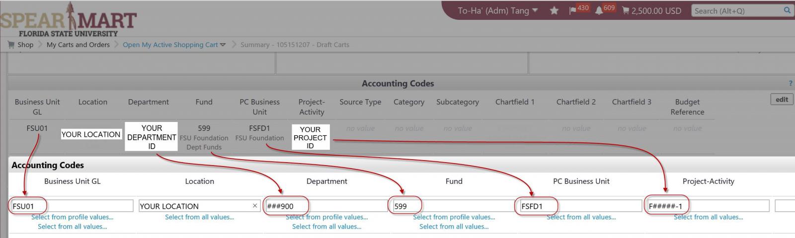 When creating Foundation Requisitions in SpearMart for a new Fund 599 Foundation Project ID, the following chartfields must be entered in this EXACT order: