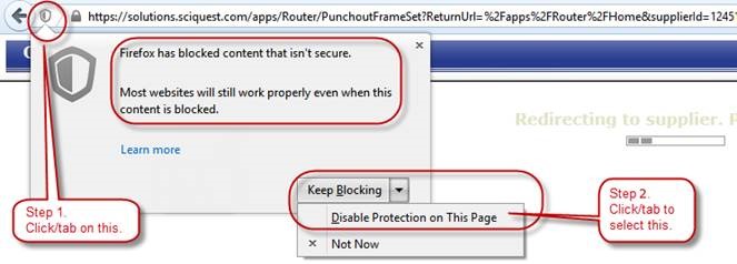 Recently, there have been an increased number of calls and emails to Procurement Services concerning problems accessing selected SpearMart PunchOut Suppliers when using either Mozilla Firefox or Google Chrome internet browsers. This is due to the introduction of Mixed Content Blockers by both browser manufacturers. If you encounter such a problem using either one of these internet browsers, please follow the simple steps listed below to resolve the problem.