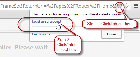 Step 2. Click/tab to select “Load unsafe script”. See image below for more detail.