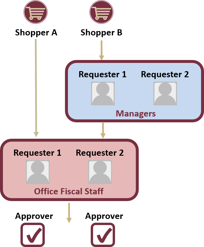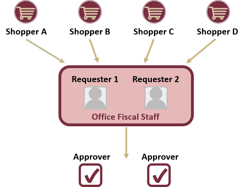 Shoppers assign carts to business manager requesters who then assign carts to fiscal staff requesters. Primary purpose for this model is to provide the opportunity for additional review based on what is being purchased.